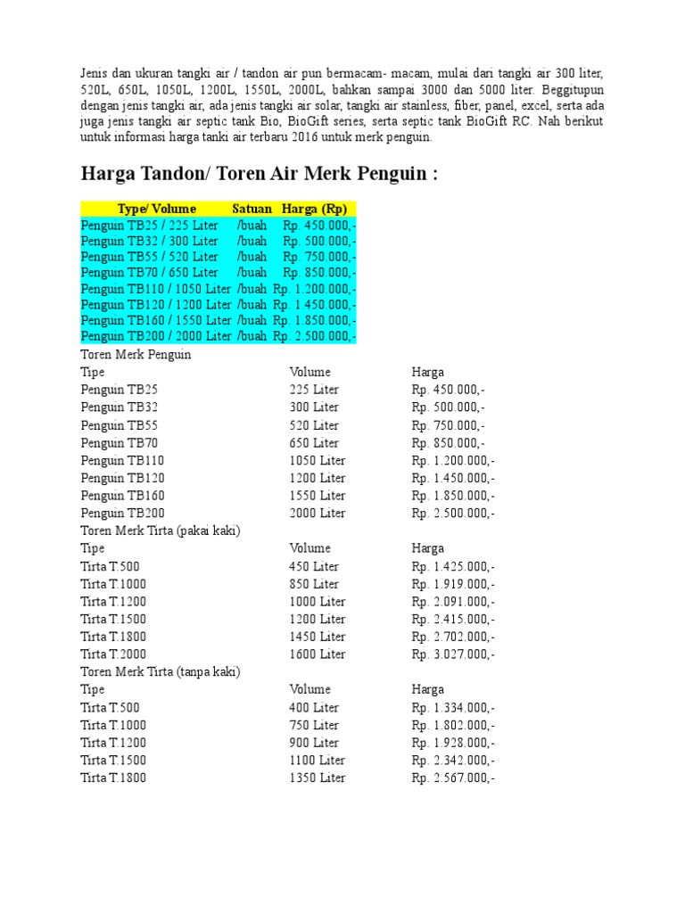 Penguin tb32 / 300 liter. Pembayaran mudah, pengiriman cepat & bisa cicil 0%. Tidak ada komentar | tangki air. Tentunya masing masing bahan memberi pengaruh harga toren air yang bervariasi. Berikut daftar harga tangki air secara lengkap : Free ongkir jakarta only melayani pengiriman jabodetabek ongkos kirim diluar jakarta harap konfirmasi terlebih dahulu daerah lain via. Hal yang harus diperhatikan saat memilih tandon air adalah kualitas dan material bahan bakunya. Toren tangki air penguin kapasitas 300 liter ( tb 32 ): Berapa kapasitas toren air penguin? Harga tangki air / tandon air / toren air excel gs 3000, 2300 liter harga tangki air excel gs 3000 2300 l free ongkir jakarta detail: Toren air / tanki air merk penguin original 300ltr: Harga tangki air / tandon air / toren air penguin tb 1000 free ongkir jakarta detail: Tb 55 tersedia warna :