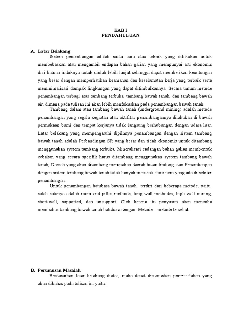 Bab i Keadaan Geologi from imgv2-2-f.scribdassets.com 2 bab ii pembahasan a. Atau biasa juga diartikan dengan cara penambangan endapan bijih pada tambang bawah tanah dengan cara pengambrukan / meruntuhkan bijih bagian atas setelah dibuat lombong ambrukan di bagian bawahnya. Pemakaian peralatan mekanis dan penerangan. Karena dapat menyebabkan hilangnya nyawa para pekerja. Fungsi ventilasi tambang pada dasarnya, sistem ventilasi tambang bawah tanah ini memiliki tiga fungsi umum, yaitu : Tahap utama dalam metode tambang bawah tanah ada dua tahap utama dalam metode tambang bawah tanah: Mengatur panas dan kelembaban udara ventilasi tambang bawah tanah sehingga dapat diperoleh suasana / lingkungan kerja yang nyaman. Makalah metode tambang bawah tanah disusun untuk memenuhi tugas mata kuliah tambang bawah tanah ii disusun oleh :