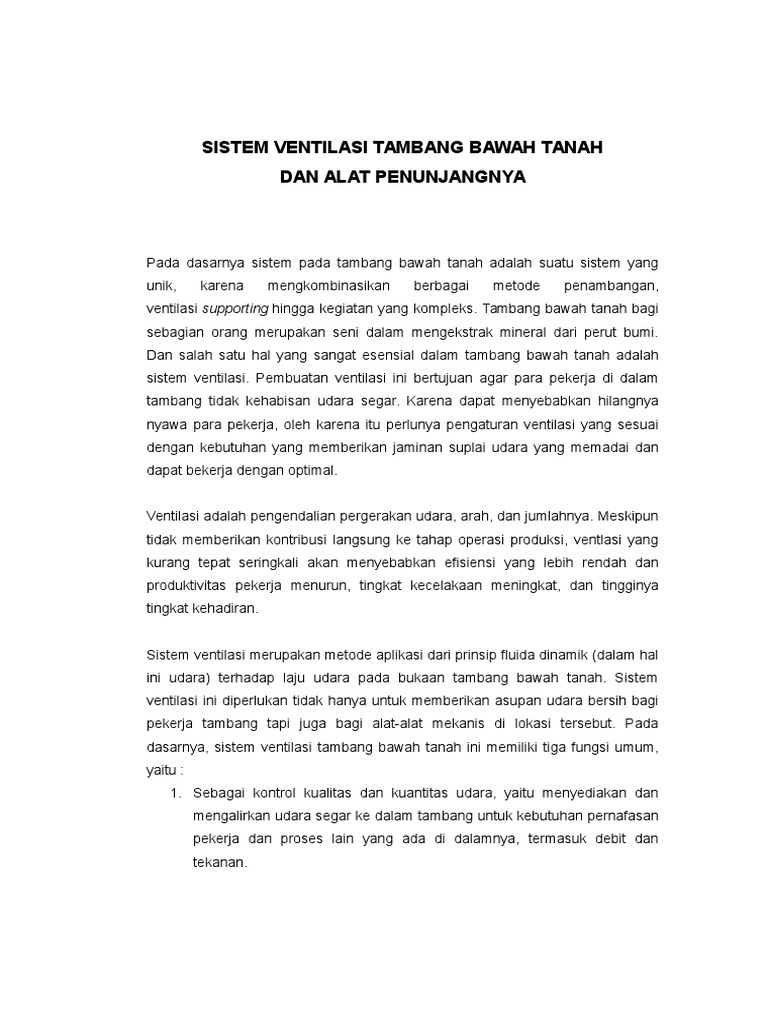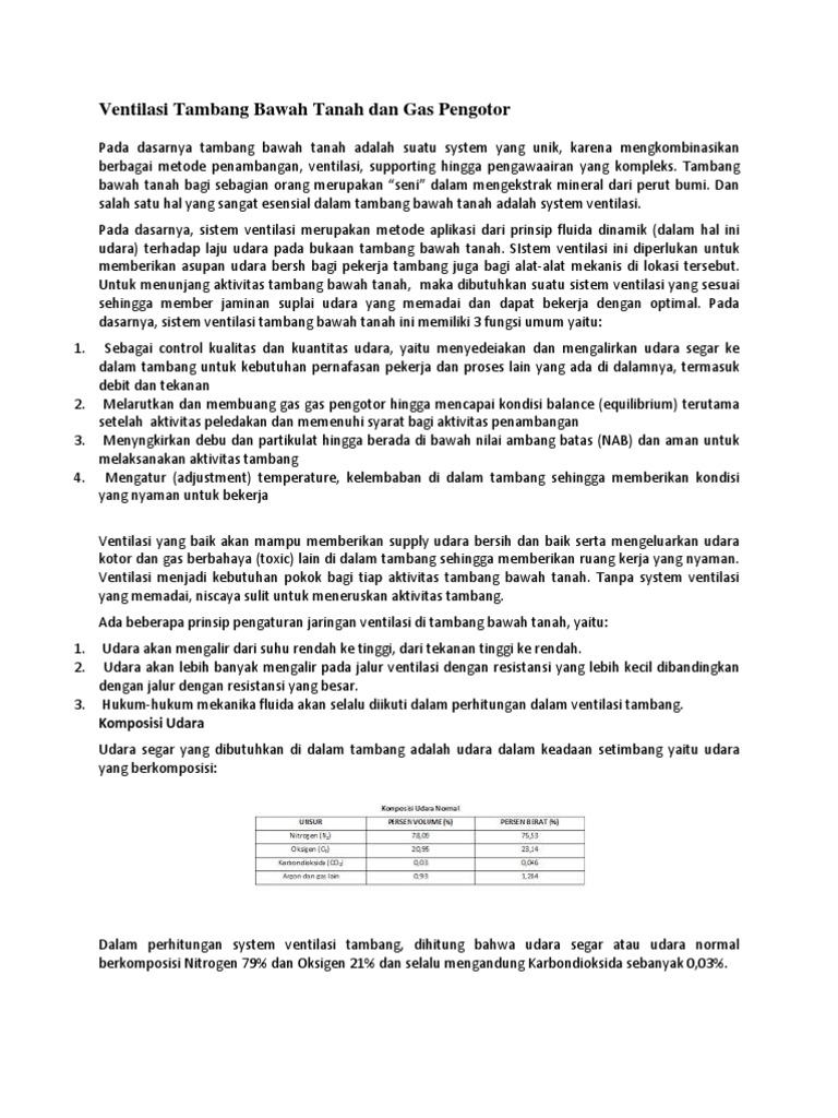 Pengukuran ventilasi dilakukan untuk memeriksa apakah pada setiap lokasi pada tambang bawah tanah telah dilakukan ventilasi udara yang cukup sehingga dapat diketahui kesalahan ventilasi atau untuk mendapatkan bahan yang diperlukan untuk perencanaan ventilasi atau perbaikan ventilasi. Ventilasi tambang merupakan penyaliran udara segar ke dalam tambang bawah tanah untuk keperluan manusia dan alat. Tambang dalam atau tambang bawah tanah (underground mining) adalah metode penambangan yang segala kegiatan atau aktifitas penambangannya dilakukan di bawah permukaan bumi dan tempat kerjanya tidak langsung berhubungan dengan udara luar. Caving method adalah metode penambangan yang bertujuan untuk memotong bagian bawah dari blok bijih sehingga blok bijih tersebut mengalami keruntuhan. Berbagai macam logam bisa diambil melalui metode ini seperti emas, tembaga, seng, nikel, dan timbal. Ventilasi tambang mempunyai peranan vital dalam porsesproses penambangan. Ventilasi tambang bawah tanah mempunyai peran penting untuk memastikan ketersediaan suplai udara segar untuk pekerja tambang, mesin bakar internal, melarutkan gas dan partikulat, maupun menjaga. Karena letak cadangan yang umumnya berada jauh dibawah tanah, jalan masuk perlu dibuat untuk mencapai lokasi cadangan. Dan untuk memenuhi kebutuhan ini, ventilasi harus baik. View tugas ventam.docx from teknik 12 at sriwijaya university. Sumber dari co 2 berasal dari hasil pembakaran, hasil peledakan atau dari lapisan batuan dan dari hasil pernafasan manusia. Dalam tambang bawah tanah, ventilasi merupakan hal yang sangat penting dalam pendukung semua kegiatan pertambangan bawah tanah yang dapat dibilang minim udara bersih. Ventilasi tambang berfungsi untuk :