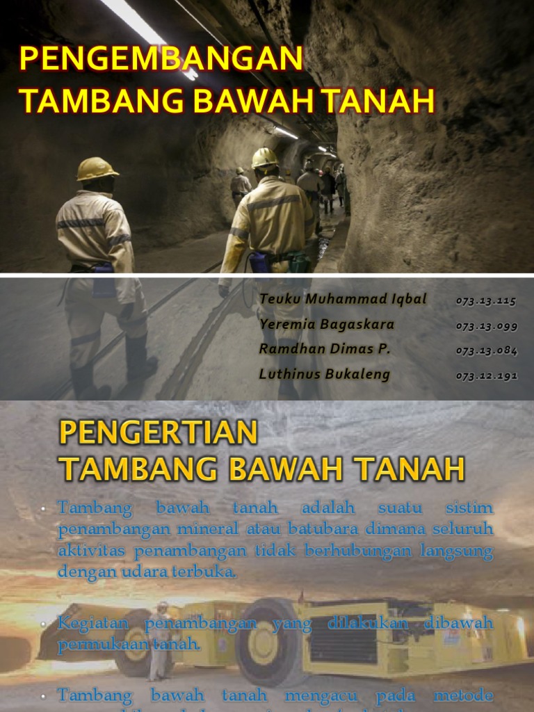 Dengan adanya ventilasi dalam tambang bawah tanah maka para pekerja akan merasa nyaman serta menerima udara yang baik ketika bekerja. Tahap utama dalam metode tambang bawah tanah ada dua tahap utama dalam metode tambang bawah tanah: Latar belakang dalam proses penambangan bawah tanah, salah satu hal yang penting adalah dibuatnya ventilasi tambang, agar para pekerja di dalam tambang tidak kehabisan udara segar. Tambang dalam atau tambang bawah tanah (underground mining) adalah metode penambangan yang segala kegiatan atau aktifitas penambangannya dilakukan di bawah permukaan bumi dan tempat kerjanya tidak langsung berhubungan dengan udara luar. Ventilasi tambang merupakan penyaliran udara segar ke dalam tambang bawah tanah untuk keperluan manusia dan alat. Tambang bawah tanah mengacu pada metode pengambilan bahan mineral yang dilakukan dengan membuat terowongan menuju lokasi mineral tersebut. Menurunkan temperature udara tambang bawah tanah 4. Aji pratama putra 1504024 program studi teknik pertambangan batubara politeknik akamigas palembang 2017 Udara akan mengalir dari kondisi bertemperatur rendah ke temperatur panas. Berbagai macam logam bisa diambil melalui metode ini seperti emas, tembaga, seng, nikel, dan timbal. 2 bab ii pembahasan a. 1 bab i pendahuluan a. Development (pengembangan) dan production (produksi).